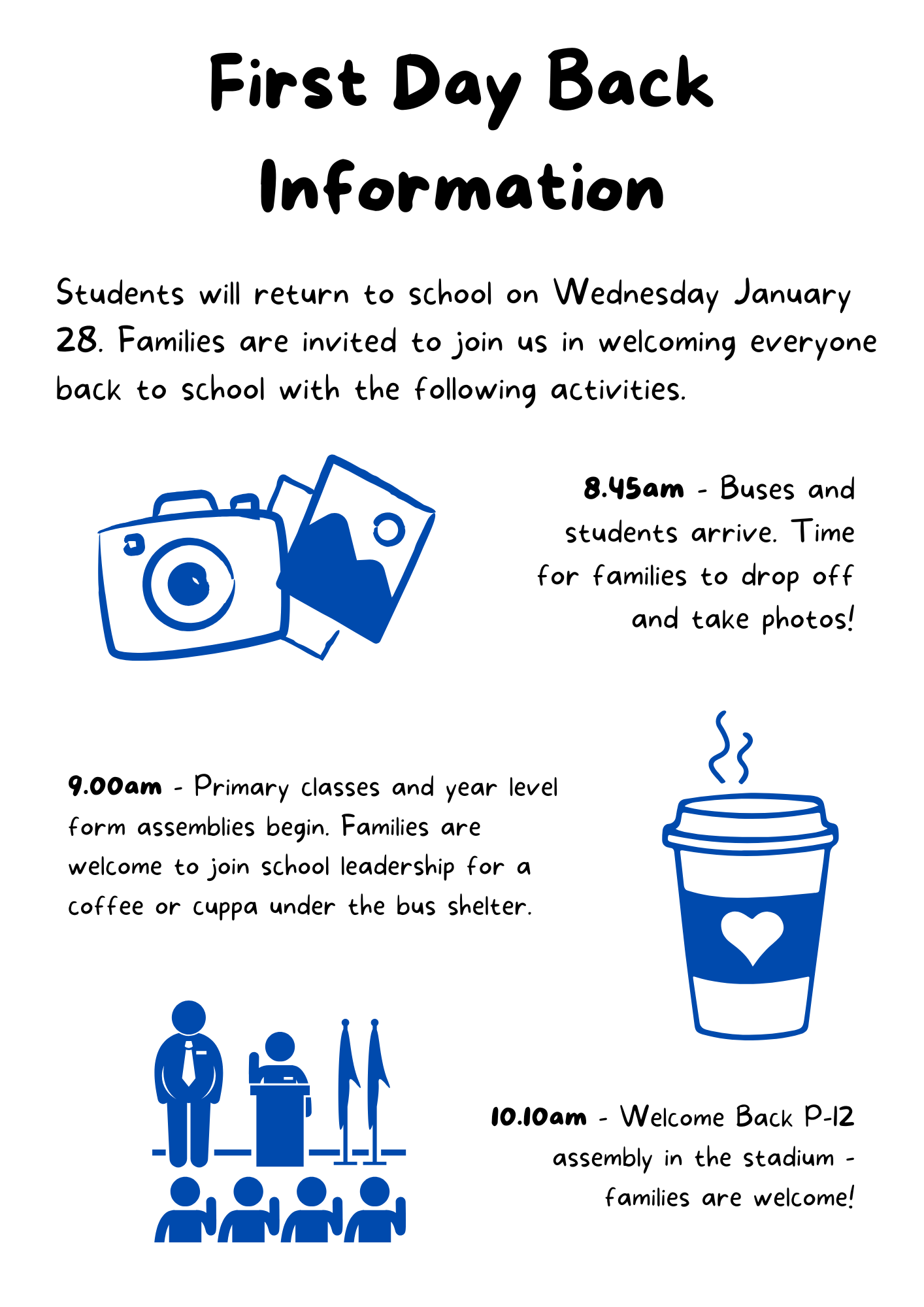 Students will return to school on Wednesday January 28. Families are invited to join us in welcoming everyone back to school with the following activities.